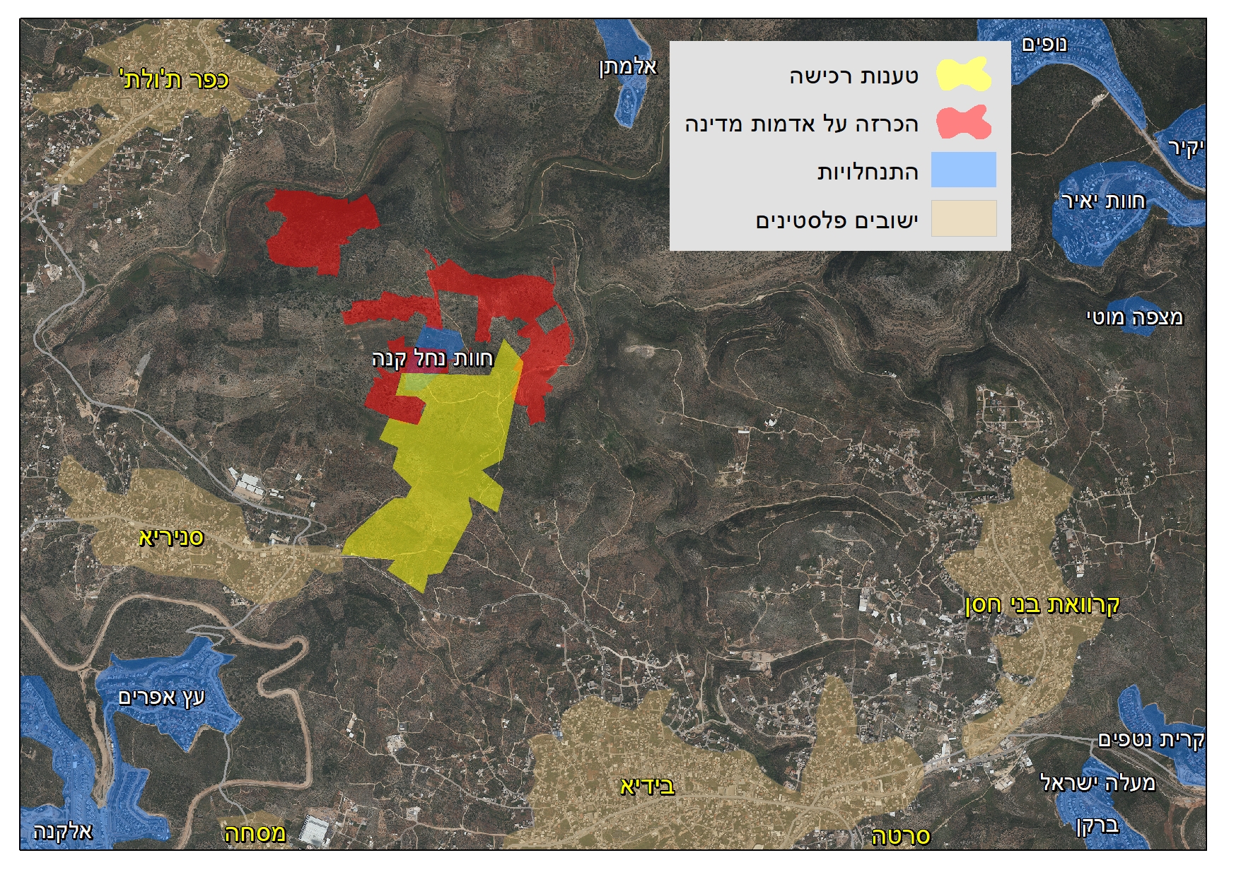 בשבוע שעבר פרסם הממונה על הרכוש הממשלתי במינהל האזרחי הכרזה על 694 דונם מאדמות הכפרים דיר איסתיא, בידיא וכפר ת'ולת' בצמוד לשמורת הטבע ואדי קנה כ"אדמות מדינה". ההכרזה היא מהלך משלים ליוזמה של יזמים פרטיים שטוענים שהצליחו לרכוש כ-200 דונם מפלסטינים באזור וכי הם בהליכי רכישת 400 דונמים נוספים. יחד עם הרכישות הפרטיות "אדמות המדינה" המוכרזות יוכלו לשמש את הממשלה להקמת התנחלות חדשה באזור של רצף פלטיני יחידי ממזרח לקלקיליה.