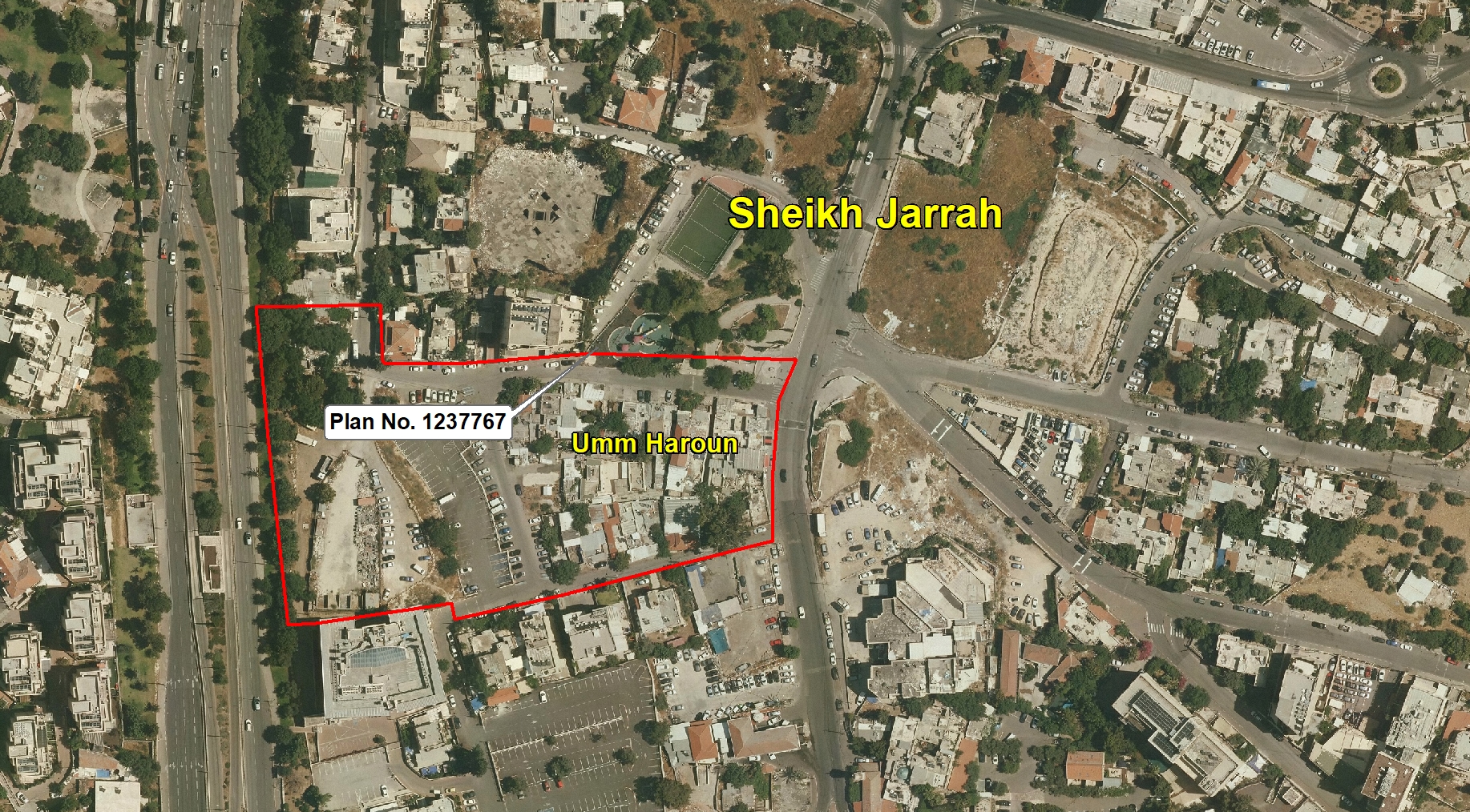 The “Nahalat Shimon” Plan in Sheikh Jarrah for the demolition of the Palestinian neighborhood of Um Haroun and the construction of an Israeli neighborhood in its place with 316 housing units. The plan (No. 1237767) is expected to severely harm the Palestinian fabric of East Jerusalem and greatly undermine the establishment of a Palestinian capital in East Jerusalem, thereby preventing the possibility of a peaceful resolution to the conflict. In the early 20th century, a small Jewish neighborhood was built on the site of the plan; it was evacuated in 1948, and its residents received alternative housing in Israel. The Jordanian authorities leased the houses under protected tenancy to dozens of Palestinian families who still live there today. In recent years, settlers—assisted by Israeli authorities—have begun suing for the eviction of the Palestinians on the basis of a discriminatory law, forcing residents to wage a difficult legal struggle to remain in their homes. The state is now seeking to demolish the houses and build a new Israeli neighborhood in their place. Since most of the Palestinian residents are no longer recognized as protected tenants by the Israeli authorities, they are expected to lose their homes without any alternative housing or compensation.