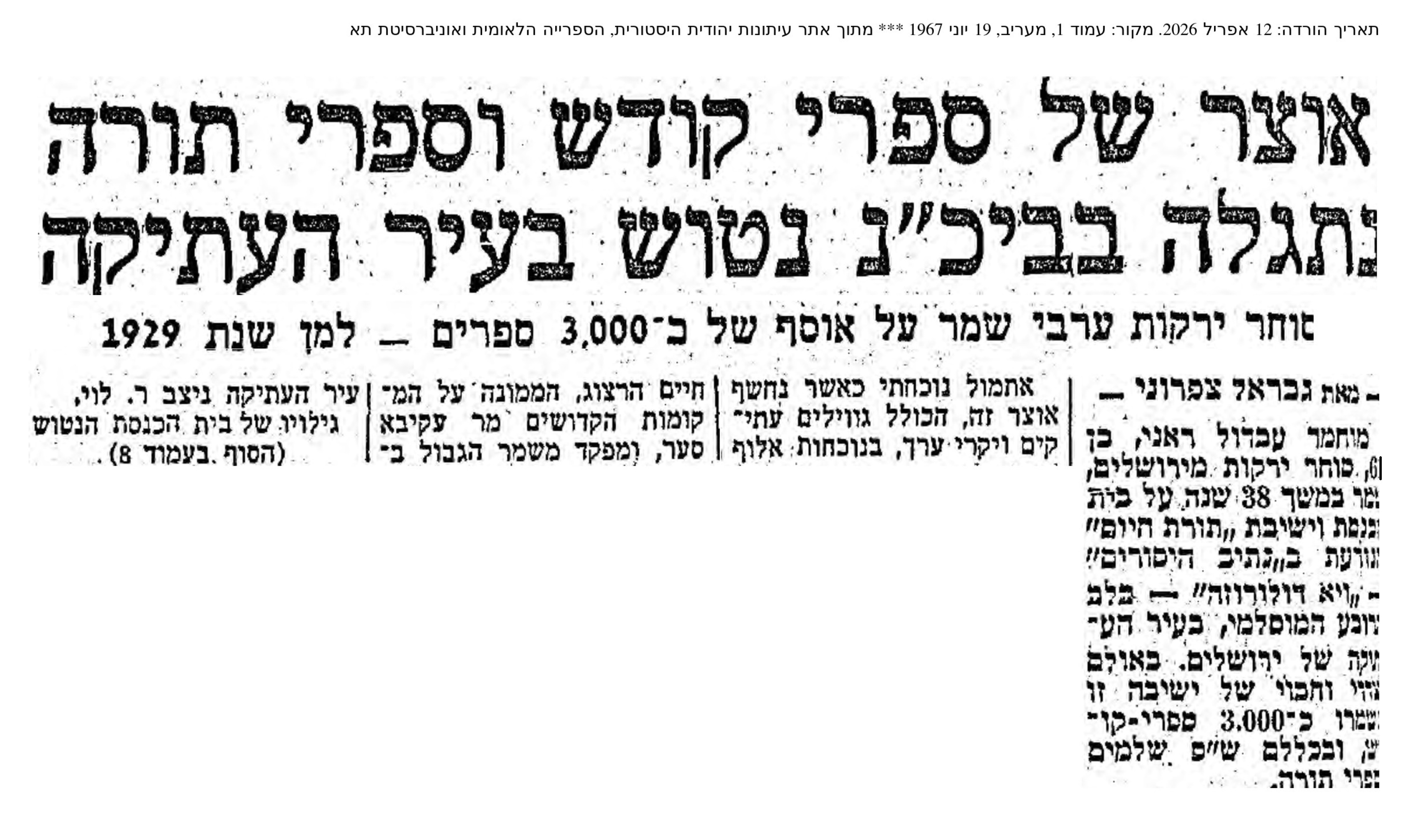 Maariv newspaper on the safekeeping of the yeshiva’s books and properties by Mofid’s father, June 1967