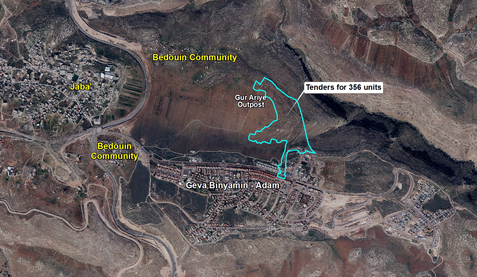 The tenders in Adam (Geva Binyamin) are based on a building plan approved this past January that expands the settlement’s built-up area by about 150 dunams, extending it toward the Bedouin community of Jaba’. In recent years, Jaba’ residents have faced increasing settler violence. In February, a new outpost — Givat Gur Aryeh — was established nearby, and since then, attacks have become a daily and increasingly violent occurrence. The new neighborhood will create a continuous built-up area linking the outpost to the settlement.