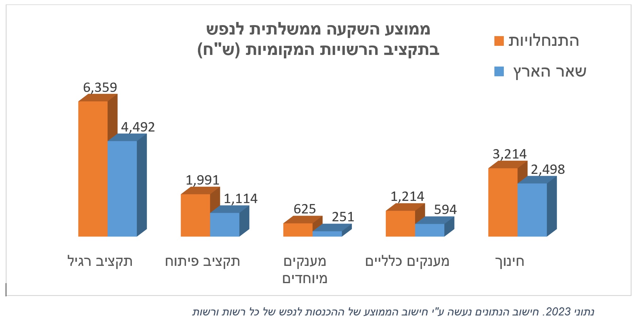 השקעה ממשלתית בתקציב הרשויות – ההתנחלויות מקבלות כ-50% יותר מהממוצע בארץ (פי 1.5).