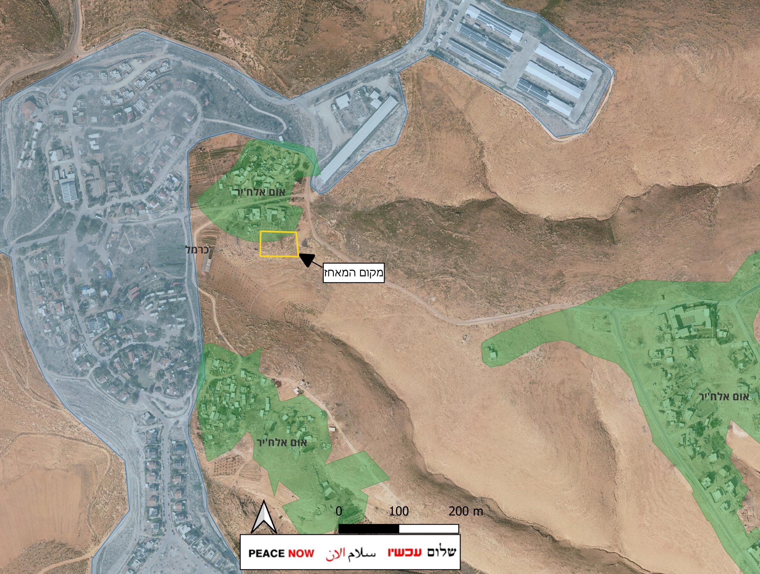 בתחילת שנות ה-80' הכריזה ישראל על כ-4000 דונם באזור כאדמת מדינה והקצתה אותם לחטיבה להתיישבות לצורך הקמת ההתנחלויות כרמל ומעון, וההתנחלות כרמל הוקמה בצמוד לאדמות אום אלח'יר. בשנת 2005 אישרה מועצת התכנון העליונה את תכנית 507/1 להתנחלות כרמל שהכלילה בתוך השטח המתוכנן של ההתנחלות כ-2200 דונם מהשטחים הפתוחים שמסביב להתנחלות. כ-7 דונמים מהשטח הזה נמצאים ממש בתוך הכפר אום אלח'יר, ועליהם הוקמו לאחרונה הקרוואנים. לפי התכנית, כל השטח הפתוח שעליו הוקם המאחז הוא שטח חקלאי פתוח ולא שטח למגורים.